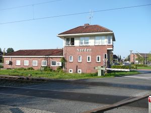 Auf der nördlichen Straßenseite befinden sich mehrere Wohnhäuser. Auf der gegenüberliegenden befinden sich ein Stellwerk und die ehemaligen Lokschuppen des Bahnhofs. Hier hat heute der Verein Museumseisenbahn Küstenbahn Ostfriesland mitsamt des Eisenbahnmuseums seinen Sitz, der die ehemalige Bahnlinie der Ostfriesischen Küstenbahn unterhält und auch mit (historischen) Zügen befährt.[1]
