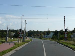 Blick in die Straße - Der Leegemoorweg (südlicher Arm) vor dem Bau des Südrings. Hinten links das ehemalige Schrankenwärterhaus - Aufnahme vom 27. März 2003.