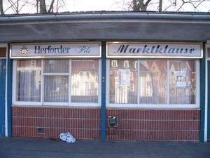 Der Marktpavillon zwischen Torfmarkt und Mittelmarkt wurde nach kurzer Bauzeit Anfang Juni 1957 eröffnet und beherbergte neben kleinen Läden, sanitären Anlagen auch einen Warteraum für Busgäste. Der Baustil lehnt sich an den Zeitgeist der 1950er Jahre an.[1] Dieser Bautyp findet sich deutschlandweit nur noch ein weiteres Mal.