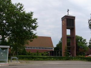 Auch der (freistehende) Glockenturm ist in einfacher, quadratischer Ziegelsteinbauweise errichtet. Im Bereich der Glocke befindet sich eine gitterähnliche Verkleidung zum Schutz der Glocke vor Witterungseinflüssen und zur Vogelabwehr.